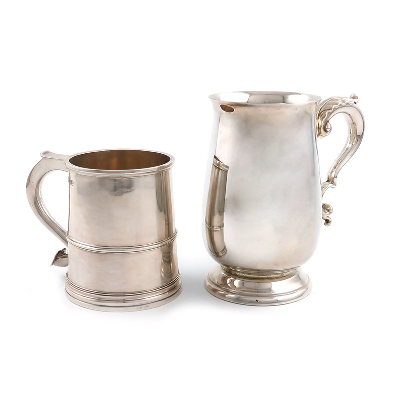 baluster form, leaf capped scroll handle, on a raised circular foot, height 13.5cm, plus another silver mug, by The Nayler Brothers, London 1939, tapering circular form, central girdle, scroll handle, height 9.5cm, approx. weight 20oz. (2)