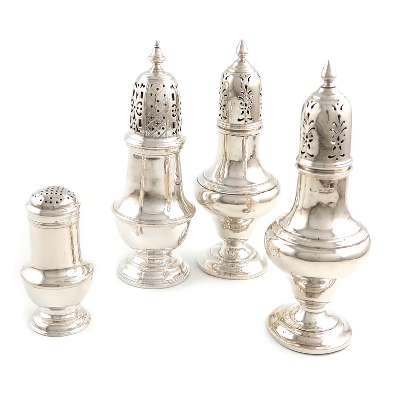 comprising: a George II bun caster, by Samuel Wood, London 1749, plus a pair of sugar casters, Birmingham 1925, and another caster, London 1932, approx. weight 16.5oz. (4)