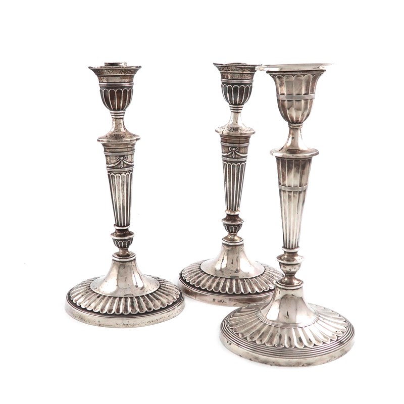 in the Adam style, fluted tapering form, on raised fluted oval bases, lacking drip pans, plus a single matching candlestick, by William Hutton and Sons, London 1899, height 18.7cm. (3)