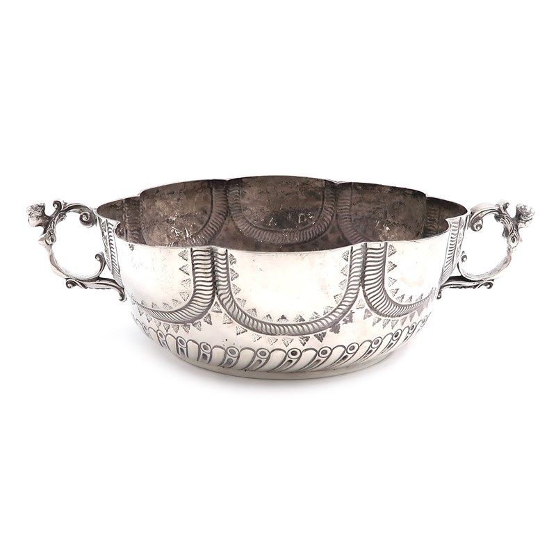 lobed circular form, caryatid scroll handles, part-fluted decoration, length handle to handle 26cm, approx. weight 18oz.