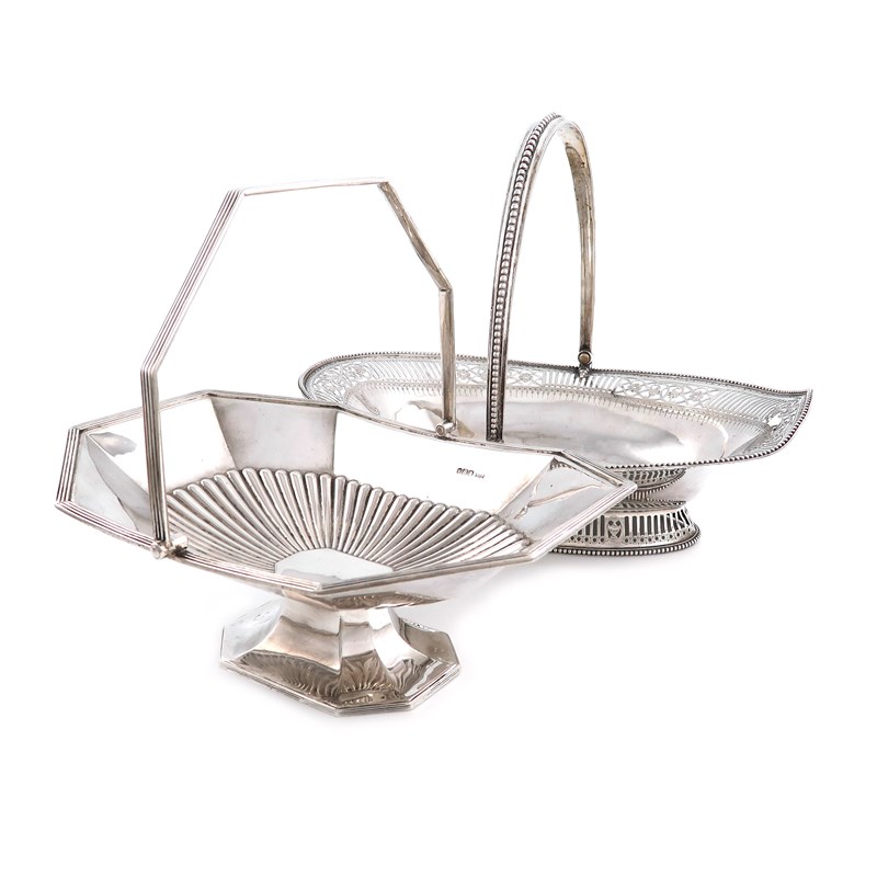 rectangular form, part-fluted decoration, reeded border and swing-handle, length 26.8cm, plus a George III silver swing-handled basket, by William Plummer, London 1783, oval form, pierced decoration, the centre with an armorial, damage to piercing, length 33cm, approx. total weight 47.8oz. (2)