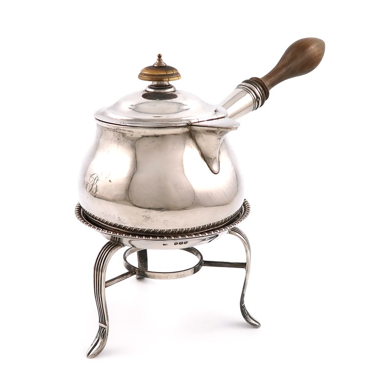 λA George IV silver brandy pan and stand with an associated George III cover
