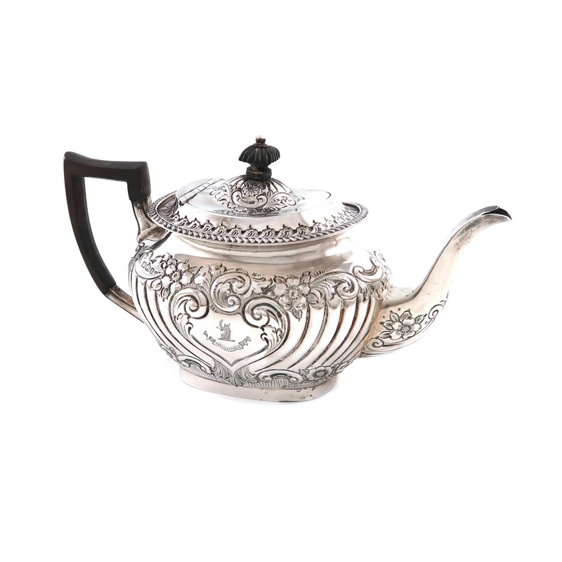 oblong bellied form, embossed foliate scroll and fluted decoration, engraved with a crest, length handle to spout 24cm, approx. weight 12.5oz.