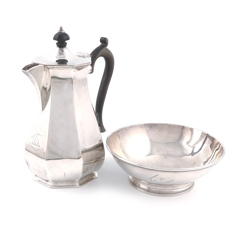 shallow circular form, on a circular foot, engraved with facsimile signatures, diameter 15.5cm, plus a silver hot water pot, by The Alexander Clark Manufacturing Company, Sheffield 1923, approx. total weight 25.5oz. (2)