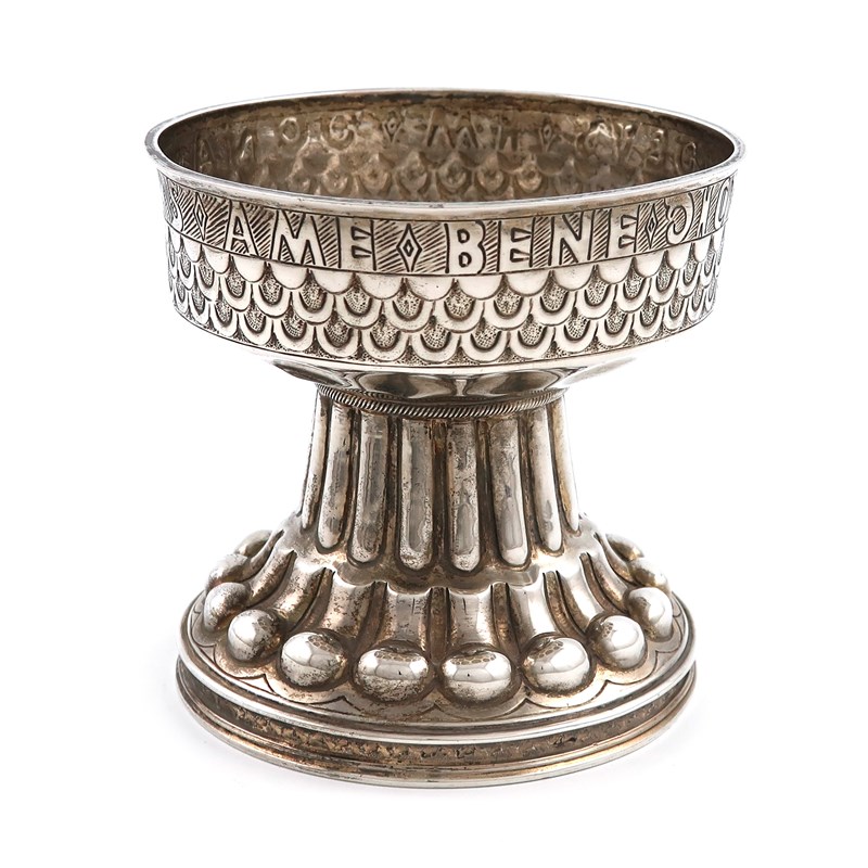 the circular bowl with an inscription, on a raised circular fluted and lobed foot, height 10.8cm, approx. weight 10oz.
