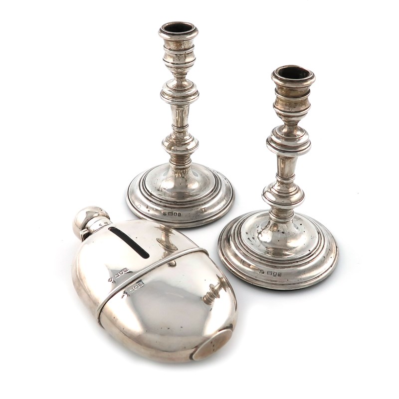knopped baluster columns, spool-shaped capitals, on circular bases, height 16.5cm, plus an Edwardian silver hip flask, by William Hutton and Sons, London 1907, oblong form, pull-off drinking cup, length 18cm. (3)