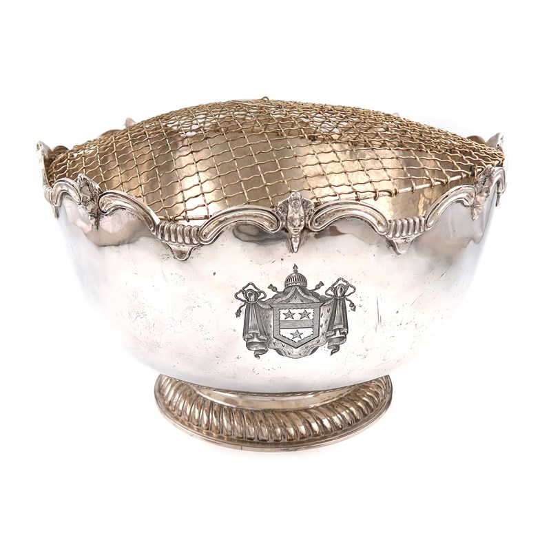 circular form, cherub head and scroll border, engraved with an armorial, on a raised circular fluted foot, with a later metal mesh flower holder, inscribed, diameter 36cm, height 22.5cm, approx. weight 76oz.