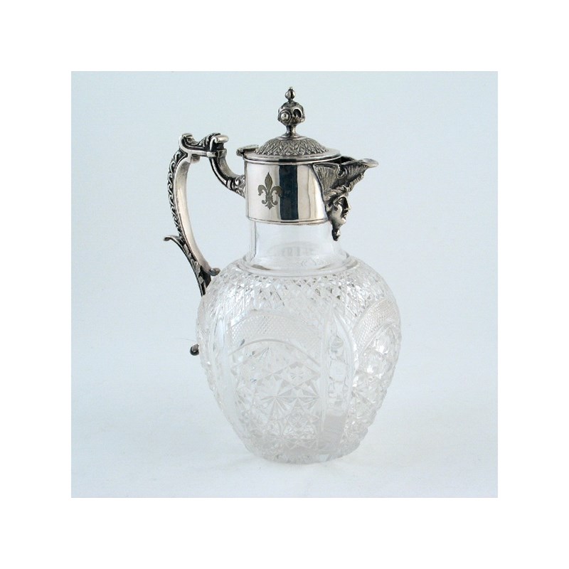 A late Victorian plated mounted cut glass claret jug , with a mask spout, c.1900, 9in (23cm).
