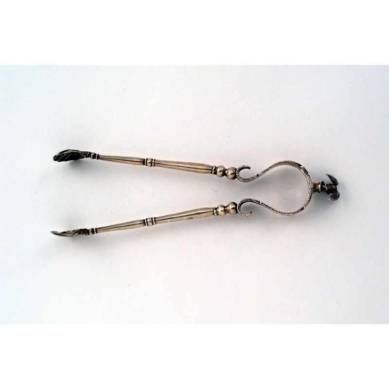A pair of Victorian andiron or embertong sugar tongs , with shell bowls, a chased sprung section, turned arms and a spread eagle finial,by Francis Higgins, London 1845, 6.2in (15.5cm), 1oz.