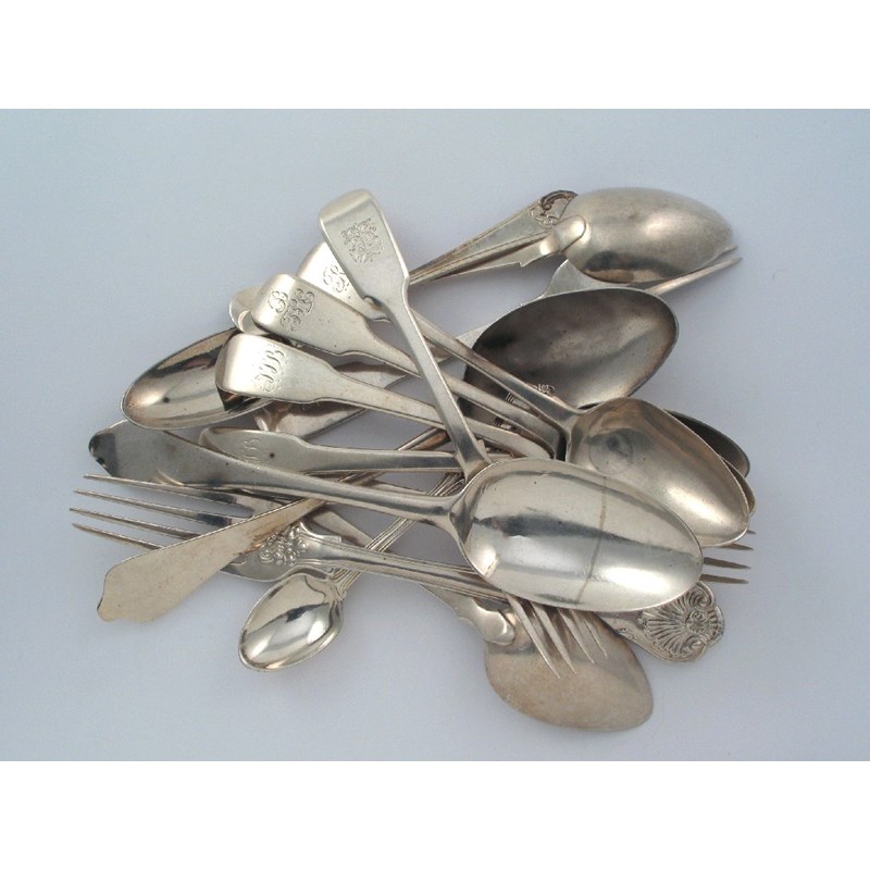 A quantity of mixed flatware including: Six fiddle pattern dessert spoons