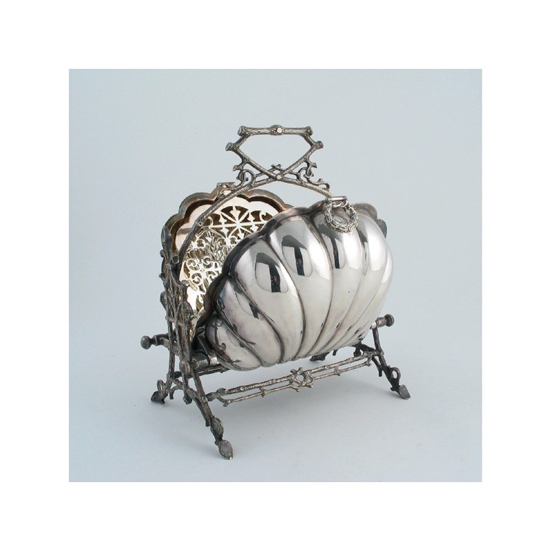 A Victorian plated 'Staniforth Patent', biscuit box, in the form of a double opening shell on a rustic frame, with decorative internal grilles, initialled, 9.75in (25cm) high.