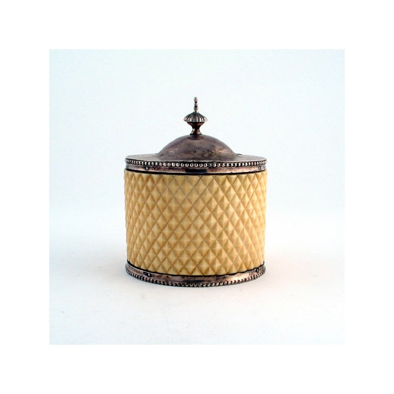 A Victorian plated mounted tea caddy , with an ivory sleeve, ???? with an all over diaper design, the engraved cover with a knop finial,unmarked, c.1870, 5.75in (15cm) high.