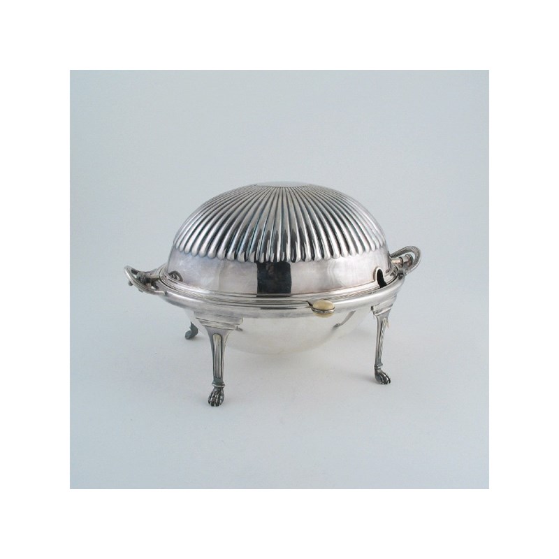 A Victorian plated breakfast turnover dish , with a liner and a strainer, gadrooned cover and ivory button, on paw feet, by Mappin & Webb, 11.75in (32.5cm) wide.