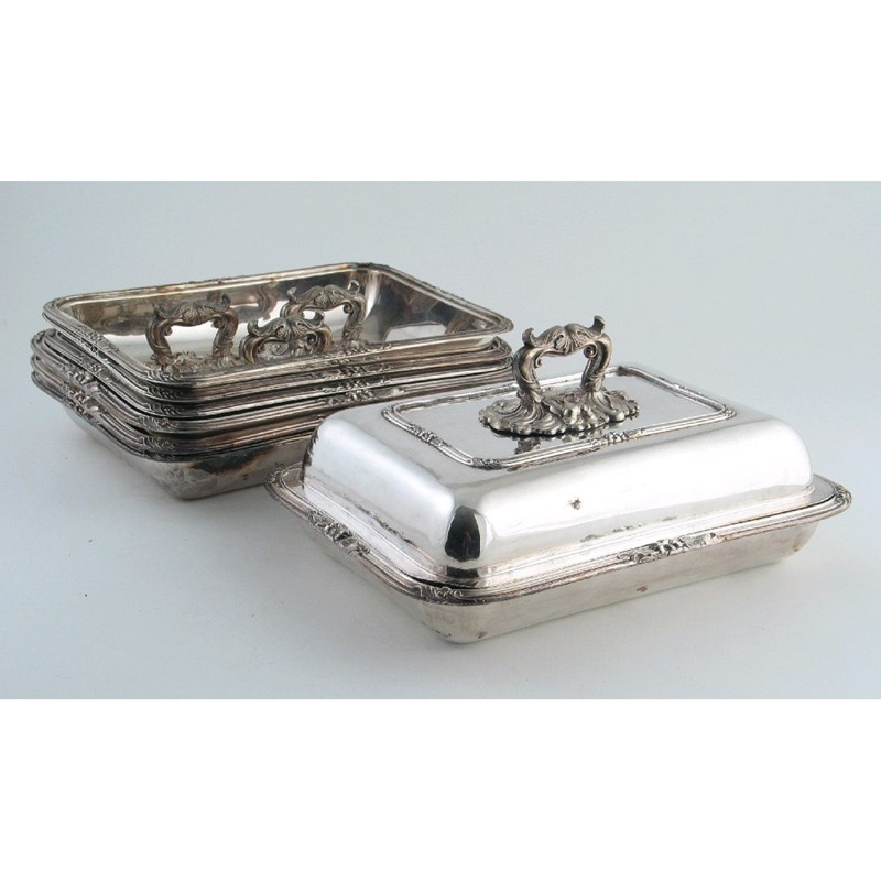 A set of four Old Sheffield plated oblong entree dishes and covers, with reed and foliate borders and detachable foliate handles. (4)