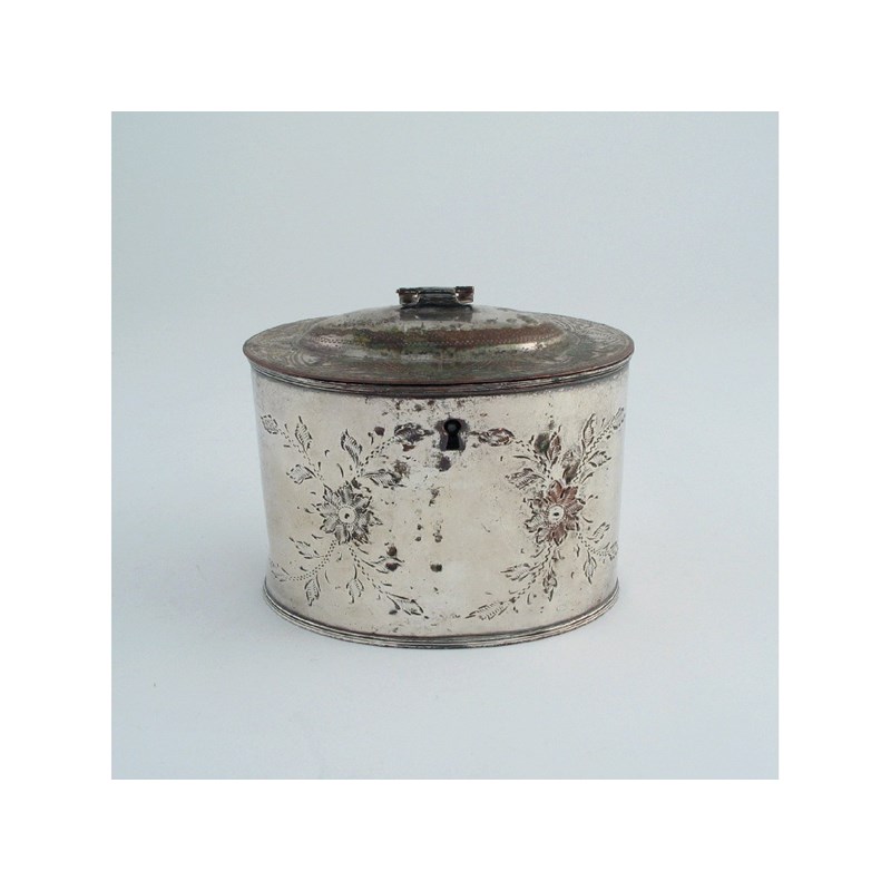 An Old Sheffield plated oval tea caddy , with swing finial, foliate decoration on the front and back and geometric work on the cover, c.1800, 5in (13cm) high.