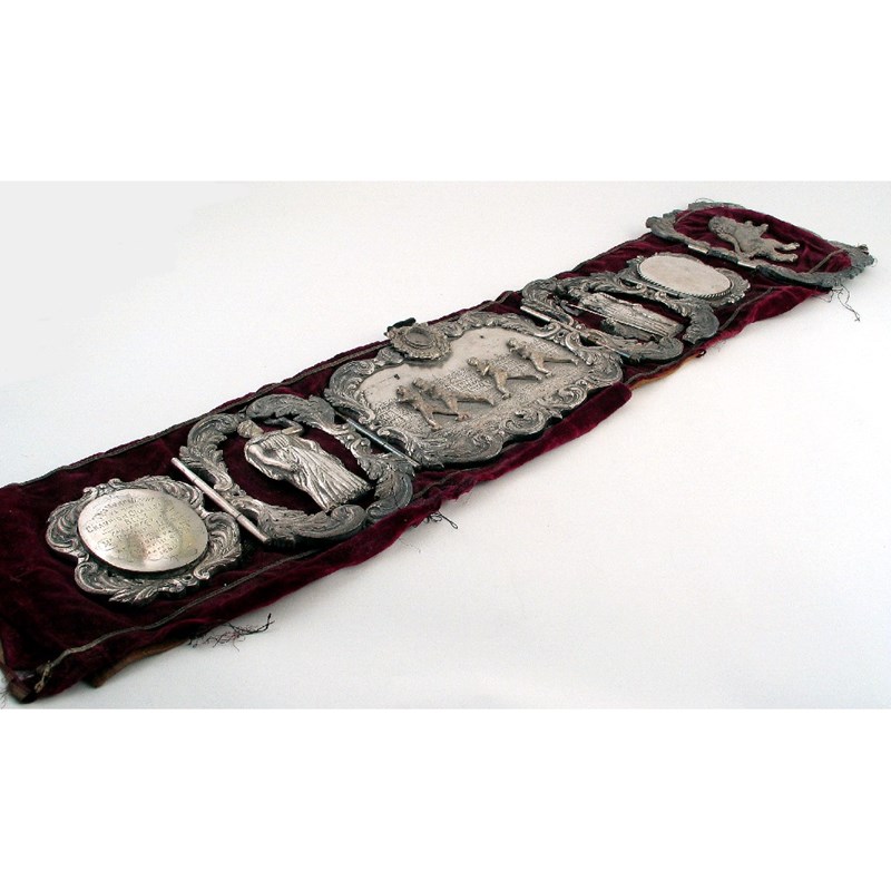 Sporting Interest: a Victorian plated mounted challenge belt inscribed "This Magnificent - 75 Hours - Champion Challenge Belt presented by Mr Richard Lewis of London at Pomona Palace Manchester March 17th 1880", 33.5in (85cm) long overall.