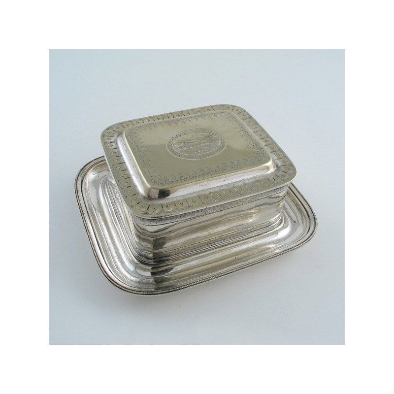 A Victorian sardine dish , with hinged cover depicting sardines and a fishing rod in an oval cartouche within an engraved border, on four bun feet, frosted glass liner, 7.4in (18.75cm).