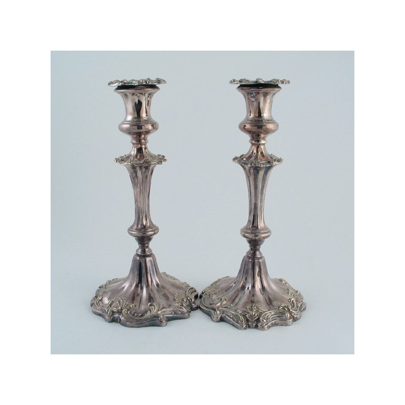 A pair of Victorian plated candlesticks , decorated with a repeating pattern of leafy foliage and scrolls, detachable nozzles, 11.25in (28.5cm).