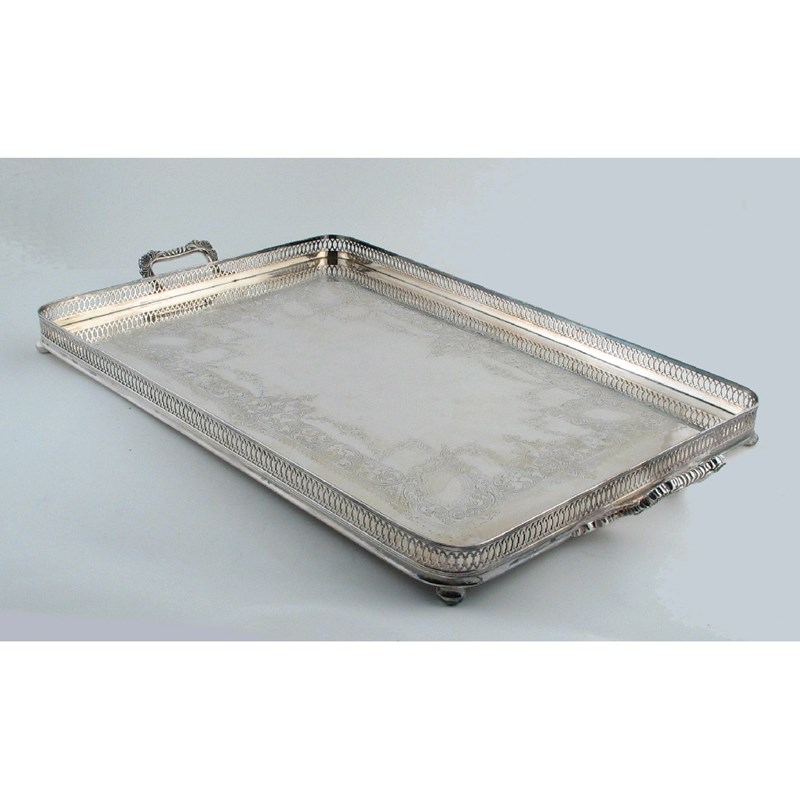 A Victorian plated gallery tray , of rounded oblong form with an engraved centre, by Joseph Rogers, Sheffield, c.1900, 25.75in (66.5cm).