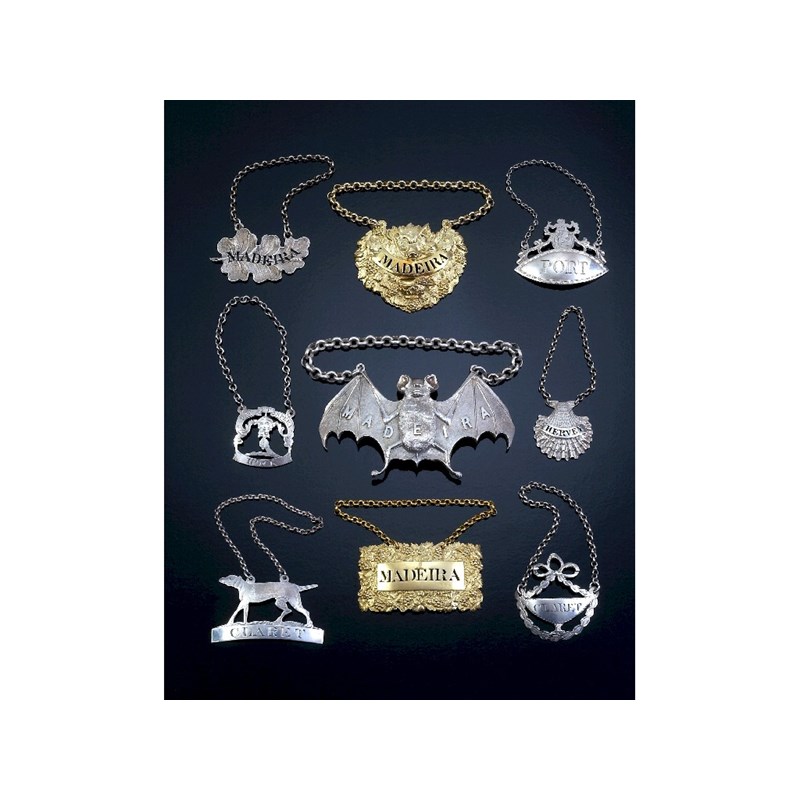 A rare George IV silvergilt wine label , cartouche shaped and die stamped, depicting a boar's mask with weapons of the chase fruiting vines and a goblet, the curved title area pierced "MADEIRA", by Thomas Johnson, London 1826.* See Wine Labels 1730-2003 by John Salter pp 95 and 96 and fig 365 for a similar label.