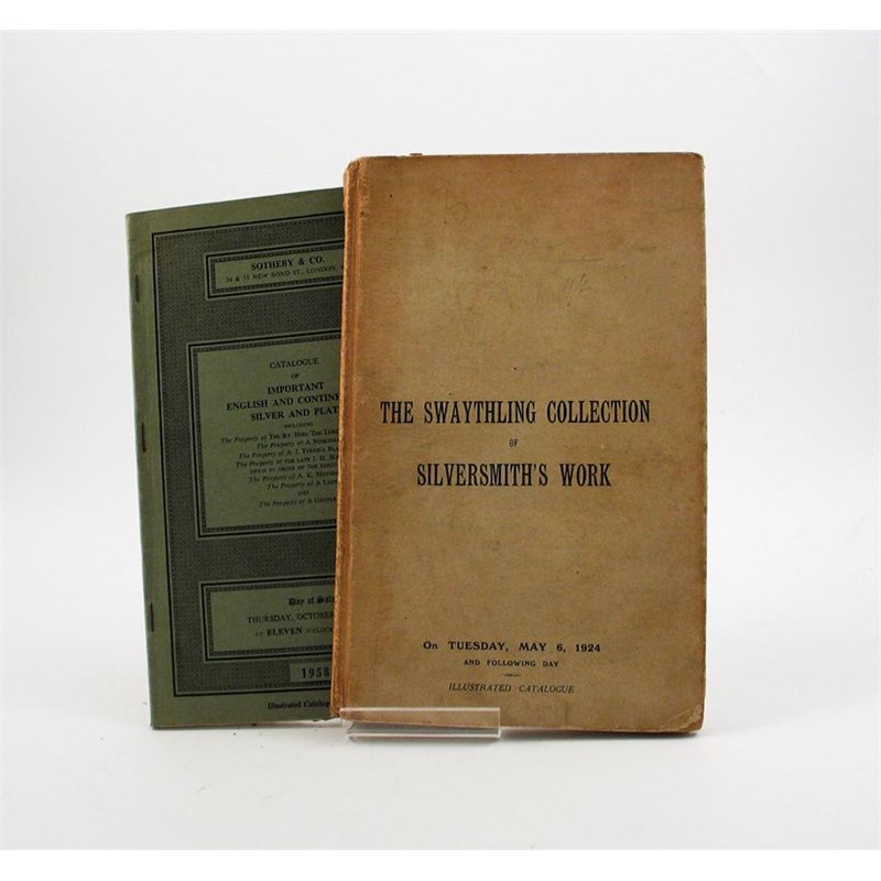 Two auction catalogues: The Swaythling Heirlooms, a collection formed by The Right Hon. Montague, First Lord Swaythling, Christie, Manson & Woods, May 6th 1924, annotated in pencil, original buff coloured hard binding, together with a Sotheby & Co catalogue of Important English and Continental Silver and Plate, October 23rd 1958. (2)