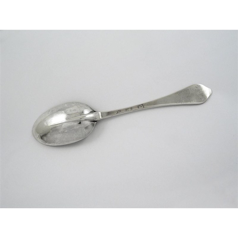 A Queen Anne wavy end or dog nose tablespoon with a plain rattail, the back of the terminal pricked "NN" over "BO*ME" over "1704" over "OCT 2", maker's mark partially worn, possibly by William Scarlett, London c.1704, (date letter worn), 1.4oz.