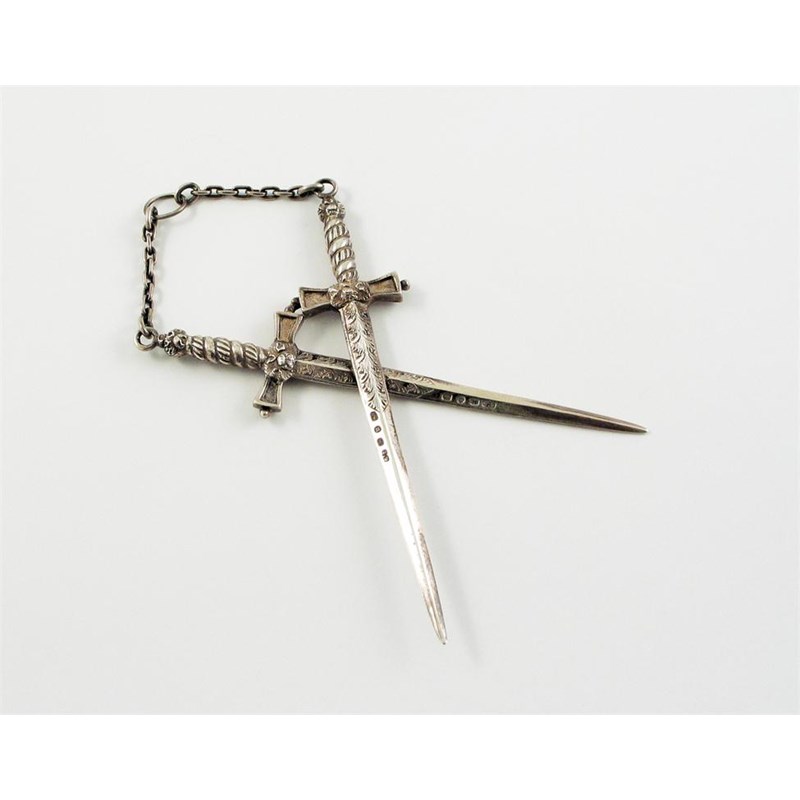A Victorian jewell in the form of crossed swords on a chain, maker's mark distorted, Birmingham 1887, 1.5oz, 4.25in (11cm) high.