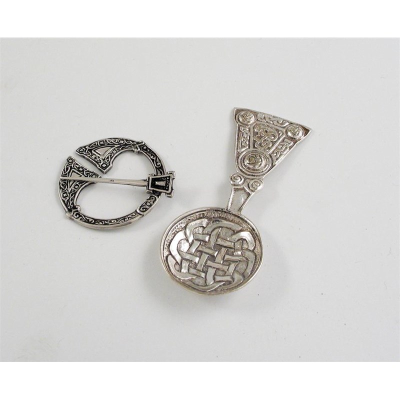 A modern 'Celtic' plaid brooch by Alexander Ritchie, hallmarked Birmingham 1934 and a 'Celtic' caddy spoon, by Celtic Art of Iona. (2)