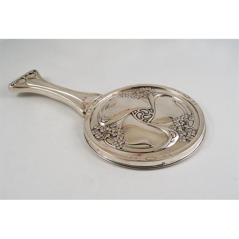 A modern hand mirror, with a fluid floral design on the back (designed by Kate Harris), by Messrs Hutton, Birmingham 1911 (loaded), 12.3in (31.5cm) long.