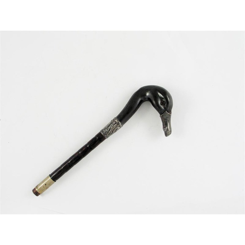 An Edwardian mounted parasol handle, with a gunmetal head and neck, cocked to one side and coloured glass eyes, by Grey & Co, London 1905, 8.5in (21.5cm) long.