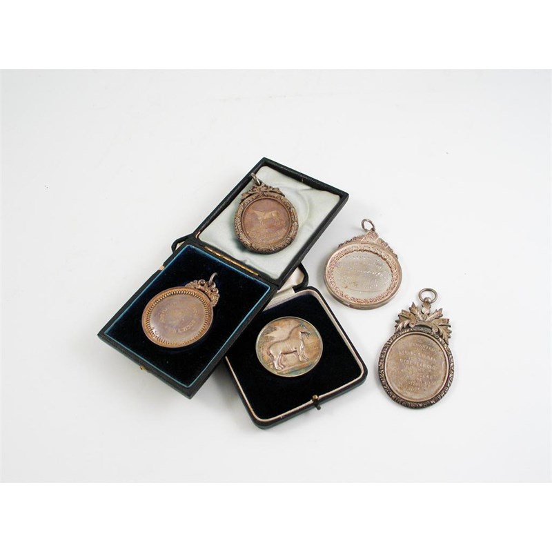 Five agricultural show medals: A Kintyre Agricultural Society medal for "yearling Filly 1931", a cased Scottish "Argyll Cattle Show Society medal 1892 for best roadster or Pony 3 years or under" on "Argyll Cattle Show oval medallion for the best yield mare or gelding....1886" a Campbeltown oval medal "for the best year old at the Ag. Soc. Show 1896" and a cased Kintyre Ag. Soc. medal presented for "best filly foal", 6.5oz. (5)