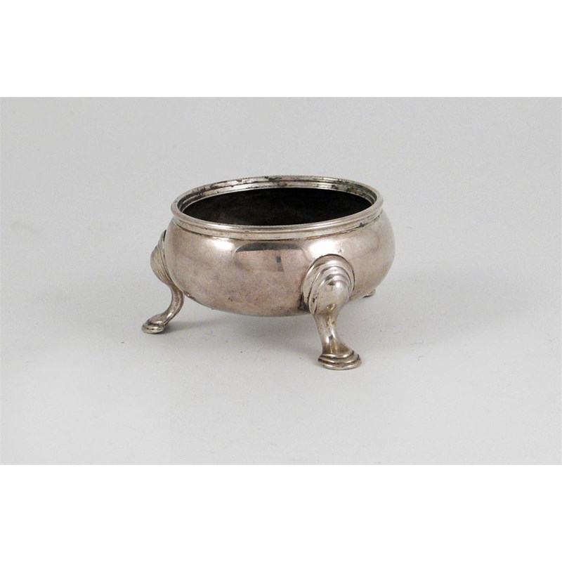 A George II Scottish circular salt, on three feet, initialled, by Patrick Murray, Edinburgh c.1742, 3in (7.5cm) diameter, 2.75oz.
