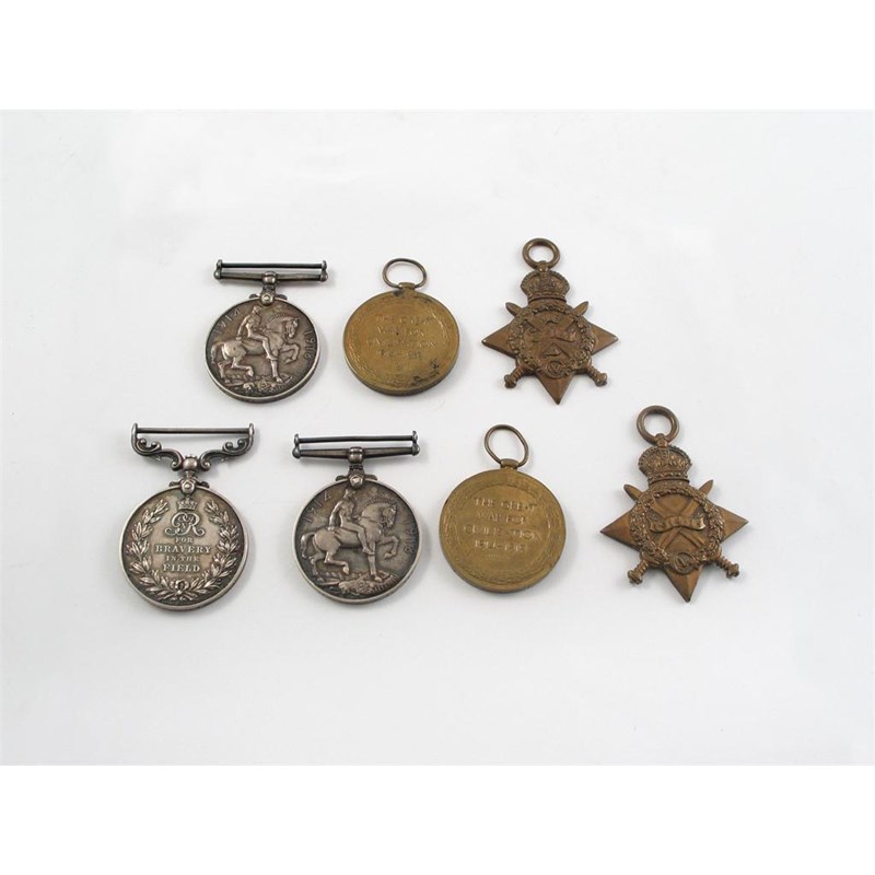 World War I, Two "Western Front" Casualty Groups awarded to brothers, one awarded a posthumous Military Medal, and killed on the first day of the Battle of the Somme: Group of four medals to Private Albert Farr, 1st Bn. Hampshire Regiment, Military Medal (lacks Bar for second award), G.V.R. (9543 Pte. A. Farr. 1/Hants. R.), 1914-15 Star (Hamps. R.), British War and Victory Medals (Hamps. R.); Three to Private L. Farr, 1st Bn. Hampshire Regiment, 1914 Star (3-3787 Pte. L. Farr. Hamps. R.), British War and Victory Medals (Hamps R). Both groups very fine. (7) 300-400