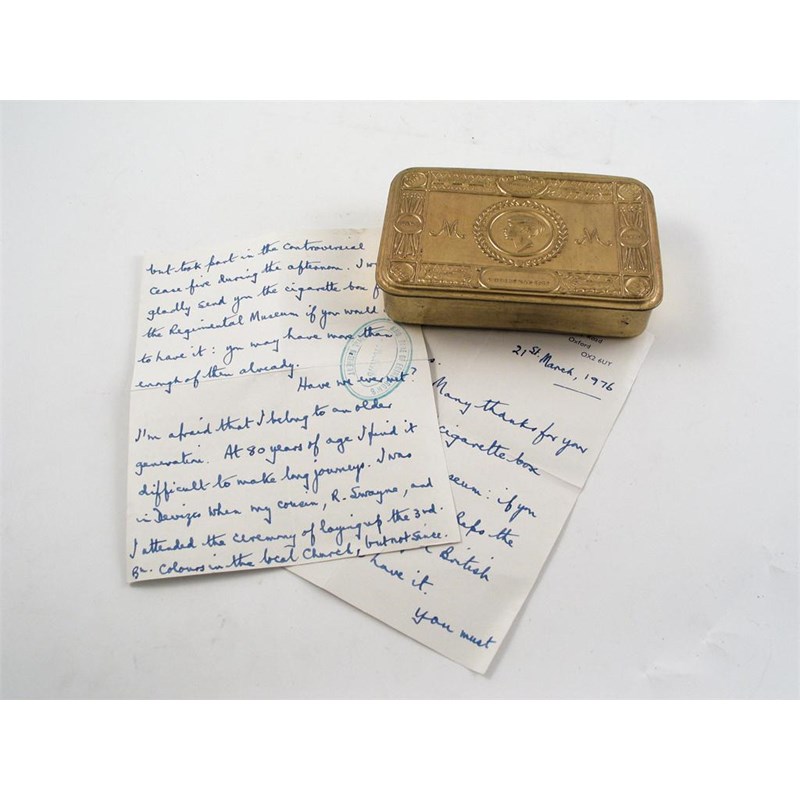 World War I, Princess Mary's Christmas Gift Box, containing original card, and letter (1975) from its recipient, an officer with the 2nd Bn, The Duke of Edinburgh's Regiment, stating, "not only in the trenches on Christmas Day but took part in the controversial cease fire during the afternoon".