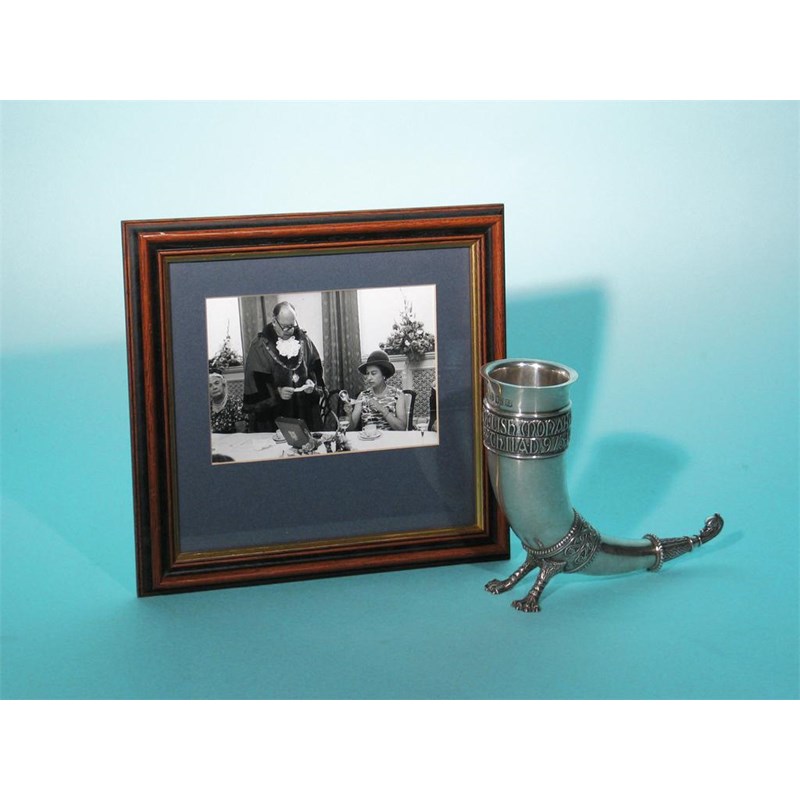 By A.E Jones: a contemporary cast drinking horn, with zoomorphic decoration and the applied inscription "1000 years of English Monarchy, Edgar to Elizabeth II. 973-1973" hallmarked Birmingham 1973, 6in (15cm) high, 15oz. *Sold with a framed black and white photograph of Her Majestry Queen Elizabeth II receiving, what looks like this very vessel.