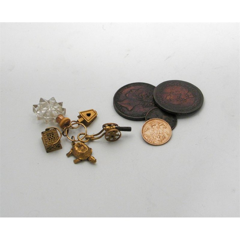 A mixed lot: five gilt-metal charms, on a ring (including a watch key in the form of a cannon), a Victorian gold half sovereign 1893, a States of Jersey1/13 of a shilling, a penny token and a farthing. (5)