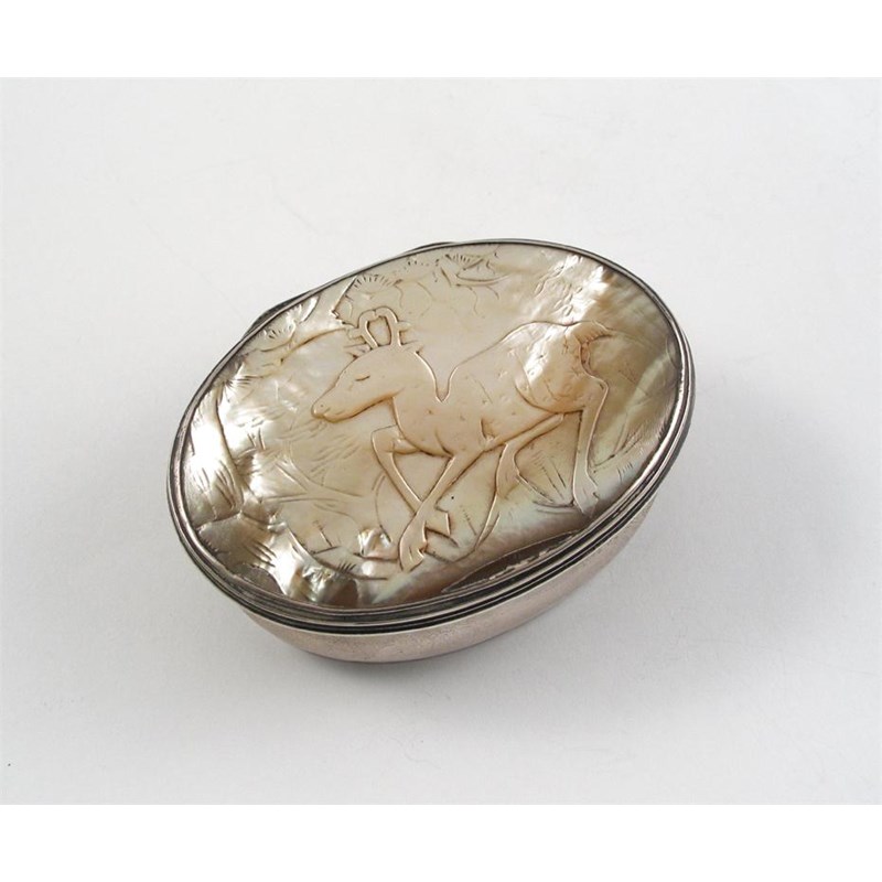 An 18th century mounted oval snuff box, with a mother of pearl base and cover, carved with a stylised deer in woodland glade, unmarked 1730 -1750, 3.1in (8cm) wide.
