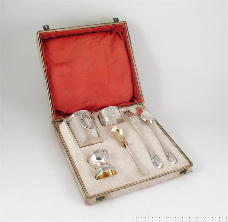 A late 19th century French cased christening set comprising: egg cup and spoon