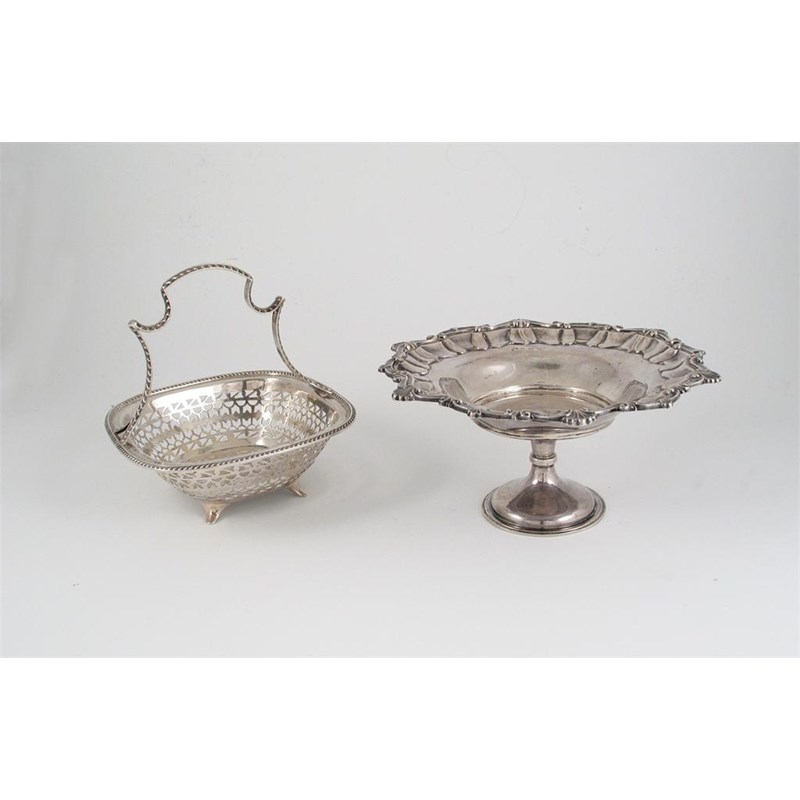 A modern pierced bon bon basket, with a fixed, gadrooned handle, by Martin Hall & Co Ltd, Sheffield 1916 and a tazza, by Alexander Clark Manufacturing Co, Birmingham 1934, the latter 8.75in (22.2cm) diameter, 22oz. (2)