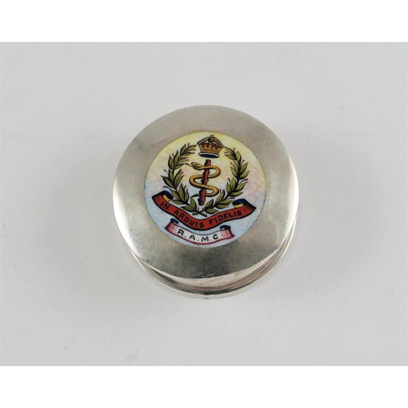 Regimental Interest: a modern small circular pill box and cover, enamelled with the badge of the Royal Army Medical Corps, by Spurrier & Co, Birmingham 1910, 1.6in (4cm) diameter, 0.5oz.