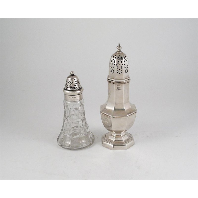 Two sugar casters: an octagonal vase shaped example, by James Dixon & Sons, Birmingham 1931 (with Irish import marks) and a mounted cut glass example, Sheffield 1919. The former 8.3in (21cm) high, 6.5oz weighable silver. (2)