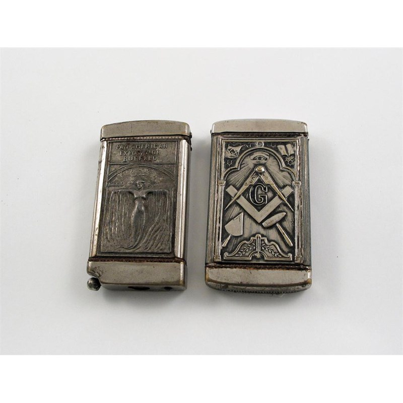 Two American plated vesta cases: one stamped "PAN AMERICAN EXPOSITION BUFFALO" and "Compliments of Fidelity Hally 609 and 611 De Kalb Ave, Brooklyn NY...." with a cigar cutter at one end and another stamped with masonic emblems. (2)