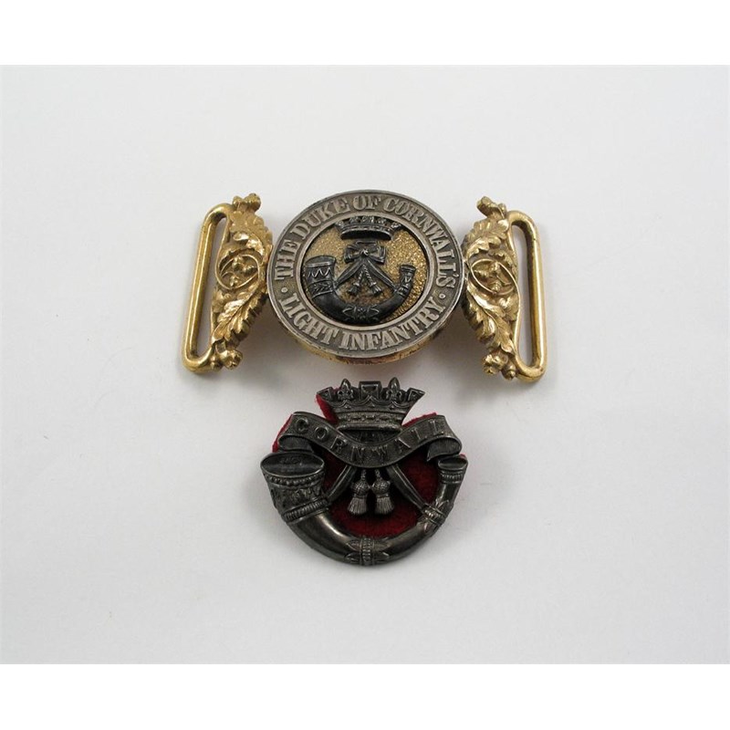 Regimental Interest: an Edwardian capbadge and a mounted, gilt-metal belt buckle of the Duke of Cornwall's Light Infantry; the badge by Jennens & Co, hallmarked Birmingham 1904. (2)