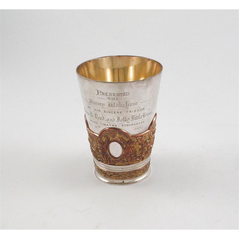 Theatrical Interest: a Victorian parcel-gilt beaker, inscribed "Presented to Jimmy Wakeham by his sincere friends John H. Reed and Jolly Little Lewis, Grand Theatre, Shonehouse Feb. 13th. 1892", by Hukin & Heath, c.1890, 5.7in (12cm) high.