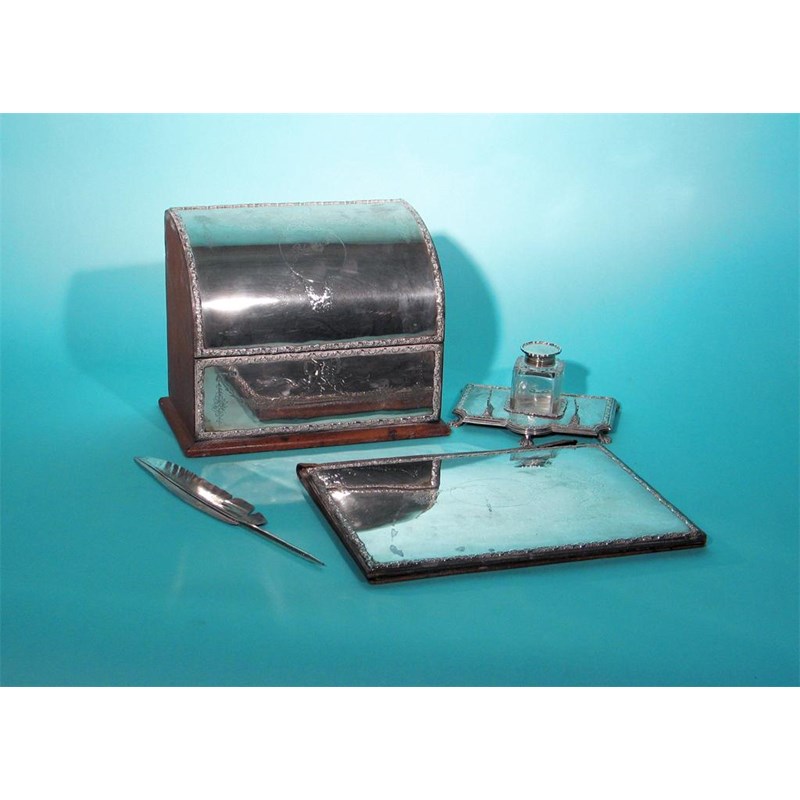 An Edwardian part desk set comprising: a mounted leather stationery box with a hinged, curved front, a mounted blotter and an inkstand with central bottle, each piece with engraving and inscribed "Gladys", by Goldsmiths & Silversmiths Co Ltd, London 1907 together with a modern Italian quill biro, the blotter 9in x 12in (23 x 30cm). (4)