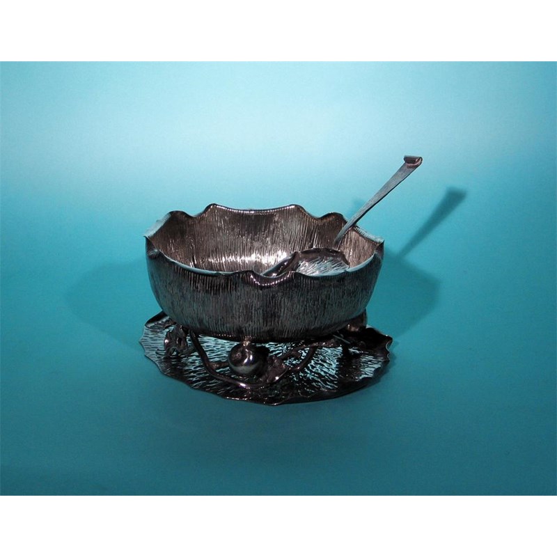 A Victorian plated rosebowl, naturalistic on a base of fruit and tendrils, by Hukin & Heath c.1880, 10.6in (27cm) diameter, together with a plated and textured crumb scoop and tray for the same maker's. (3)