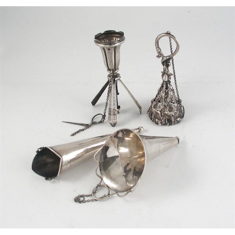 Four posy holders: A Victorian example, with stamped floral decoration, chain and finger ring, and a loop handle, inscribed "L R Aug't 12th 1869", unmarked, 5in (12.8cm); another late 19th century example with engraving and the handle which forms three legs for support (needs attention); a conical example by A D & Lovekin, Birmingham, 1912 and another similar trumpet shaped example by S Blackensee & Sons, Birmingham, 1910, (4), 4oz in total.