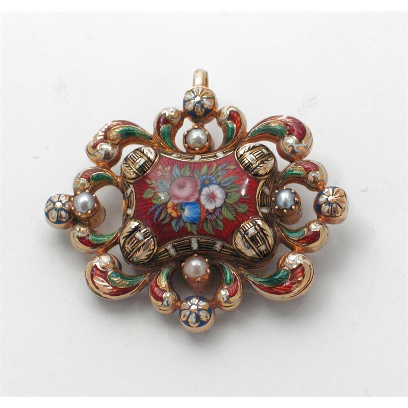 An early 19th century Swiss gold and enamelled viniagrette, cushion-shaped with openwork scroll borders, painted with polychrome flowers on the base and cover and set with half pearls, the grille pierced with a flower and scrolls, unmarked 1820-40 (probably originally fitted on an ena?? ??? and now with a suspensory hook), 4.25in (1.6cm) wide.
