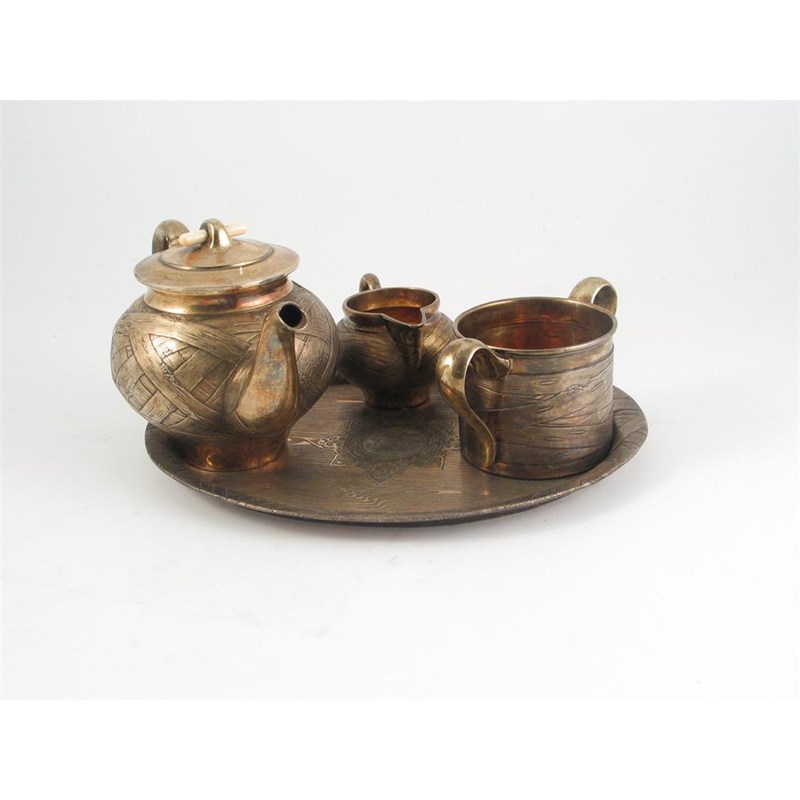 A late 19th century Russian silvergilt tea service with trompe l'oeuil decoration comprising: teapot with detachable cover and ivory rod finial, milk jug, sugar bowl and matching oval tray, initialled in the centre, the whole decorated with simulated birch bark and wood graining by Ivan Khlebrickov, Moscow 1873, the tray 9.25in (24cm) wide, 36oz.