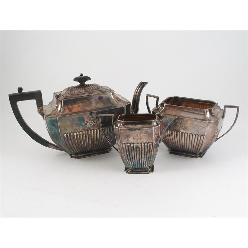 A late Victorian three piece teaset, with panelled and part-fluted bodies, each piece monogrammed and inscribed underneath "Amy M. Mayo from her sister 1894", by Atkin Bros, Sheffield 1893, 26oz. (3)